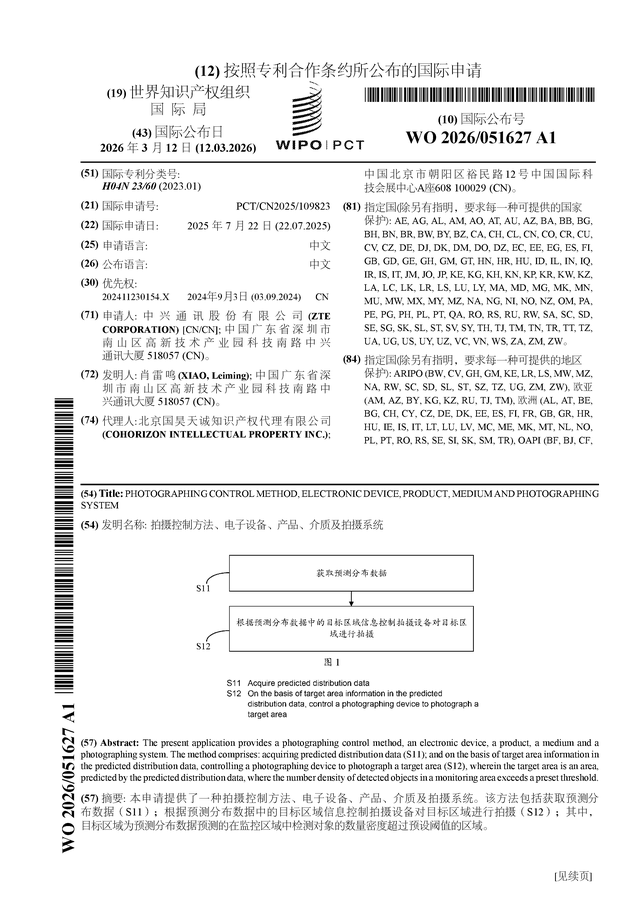 证券之星消息,根据企查查数据显示中兴通讯(000063)公布了一项国际专利申请,专利名为“拍摄控制方法、电子设备、产品、介质及拍摄系统”,专利申请号为PCT/CN2025/109823,国际公布日为2026年3月12日。