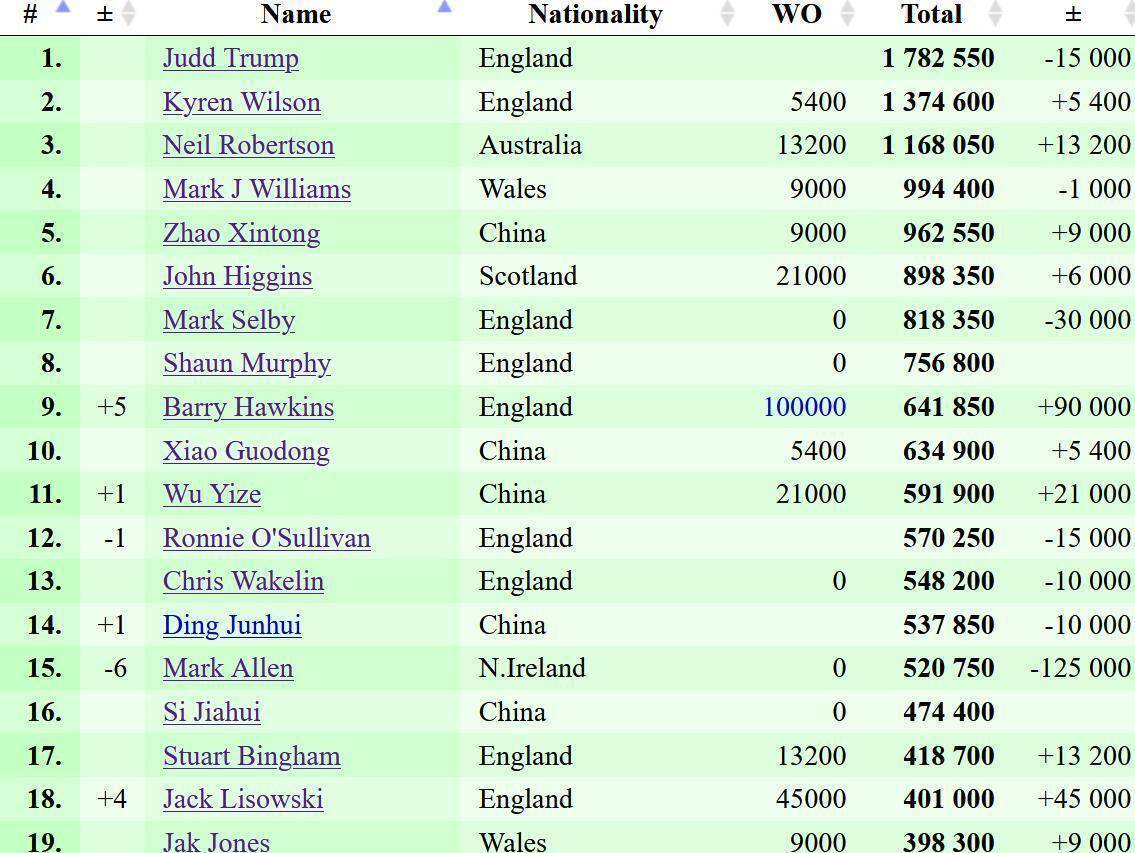 约翰·希金斯、马克·塞尔比、肖恩·墨菲分列第六至第八位。 新科冠军霍金斯从第14位跃升至第九位。 另一位中国选手肖国栋则位列第十。