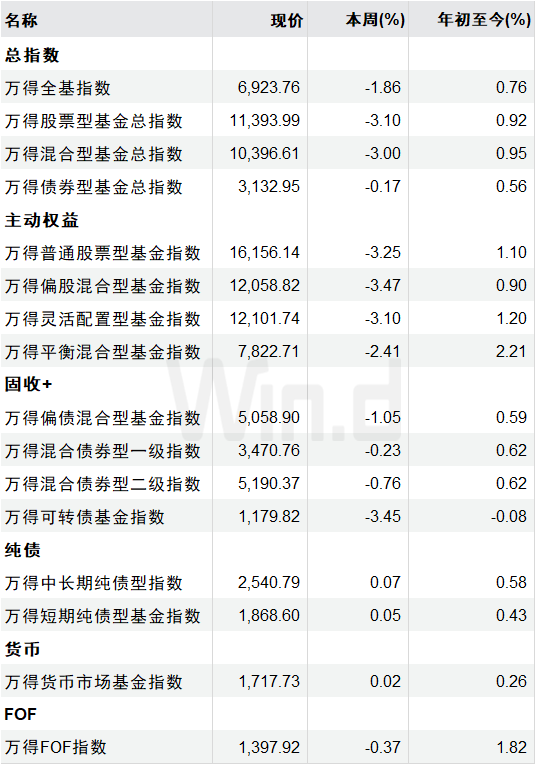 最近一周,万得基金指数整体呈现震荡回调态势。具体来看:万得全基指数下跌1.86%;万得股票型基金总指数下跌3.10%;万得混合型基金总指数下跌3.00%;万得普通股票型基金指数下跌3.25%;万得偏股混合型基金指数下跌3.47%;万得灵活配置型基金指数下跌3.10%。