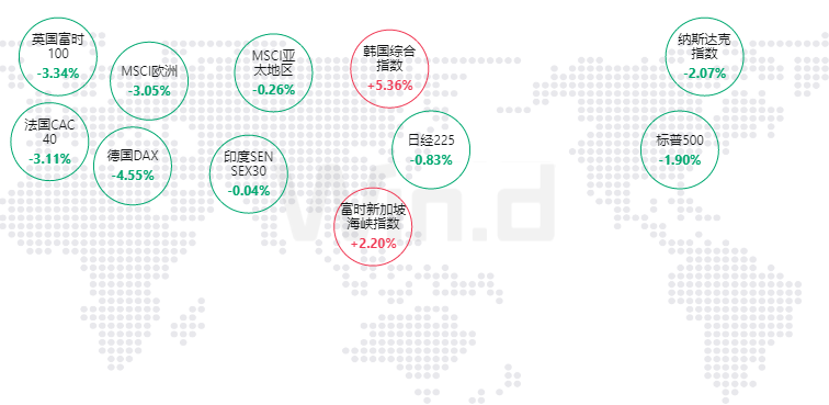 欧洲市场方面:英国富时100指数下跌3.34%,法国CAC40指数下跌3.11%,德国DAX指数下跌4.55%。