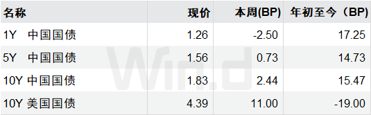 最近一周,国债收益率表现分化。1年期中国国债收益率下行2.50个基点至1.26%,5年期上行0.73个基点至1.56%,10年期上行2.44个基点至1.83%。10年期美国国债收益率上行11个基点至4.39%。