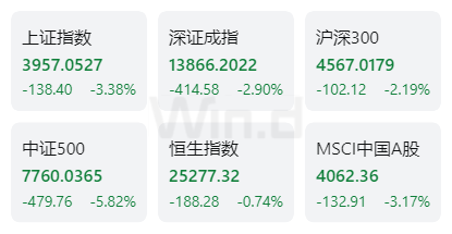 中国市场方面:上证指数下跌3.38%,深证成指下跌2.90%,沪深300指数下跌2.19%,中证500指数下跌5.82%;恒生指数下跌0.74%。