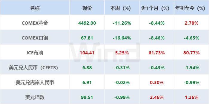 商品市场方面,贵金属呈现回调走势:COMEX黄金大幅下跌11.26%,COMEX白银大幅下跌16.64%;国际油价飙升,ICE布油大幅上涨5.25%。