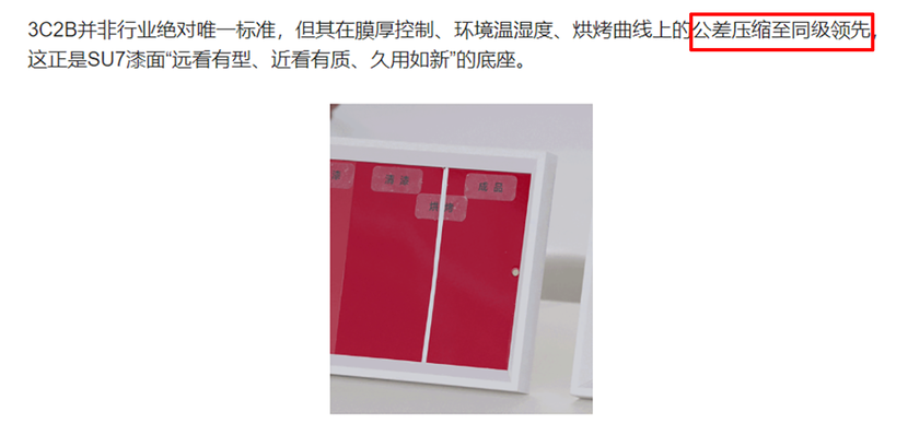 简而言之就是三次喷涂、两次烘烤,白车身的镀锌板需要预处理和电泳,形成钝化膜;随后则是中涂、色漆、清漆,对应层可以理解为底漆、色彩漆层和用于提升亮度和保护色彩漆层的最外层的清漆。3C2B工艺并不是业内的唯一标准,这一点在小米汽车相应的解读中也有提到;不过其文章中也提到在膜的厚度控制、环境温湿度、烘烤曲线上的公差方面,其做到“公差压缩至同级领先”水平,但由于目前没有具体数据,其真实产品领先与否是无法下结论的。