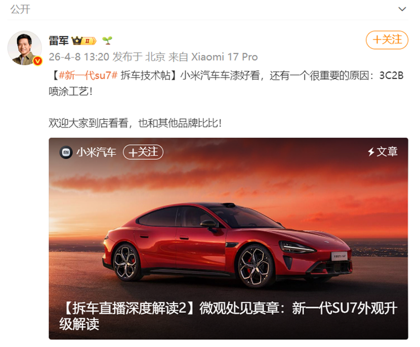 毕竟汽车用户更注重的是产品自身而非产品制造过程中是否会产生更多污染。并且高端汽车产品也确实需要更具质感的视觉效果,小米SU7、YU7两款汽车产品的价格覆盖中端车和高端车的价格带,属于中高端汽车产品;其作为新势力品牌的品牌竞争力客观来说还是不够强的,所以提高产品竞争力是非常有必要性的,那么使用更高标准的3C2B喷涂工艺也是可以理解的。