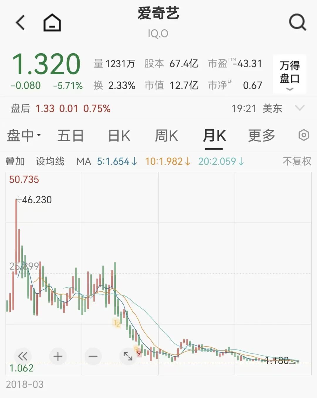 2018年3月29日,爱奇艺在纳斯达克上市,发行价18美元,上市两个月后股价冲到46美元,市值超过310亿美元。龚宇是那年中国互联网最风光的创始人之一。2026年4月21日,爱奇艺股价1.4美元。市值约13亿美元。八年时间,市值蒸发97%,价值折合人民币超2180亿元。